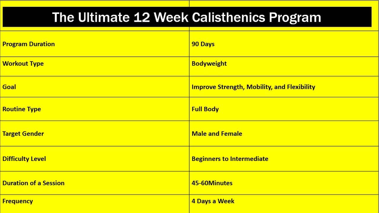 In this article, I’ve shared a comprehensive, easy-to-follow, and effective 12 week calisthenics program that will allow you to train in an organized way and help you build a firm, aesthetic, and flexible physique.