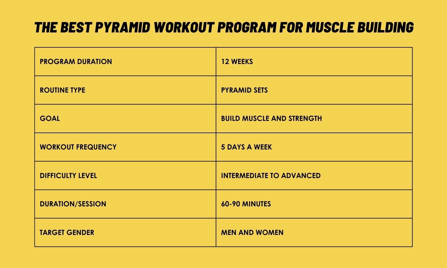 I hope it’s clear what pyramid training is and how to do it. Now, let’s see an example of a 12-week pyramid workout plan that can break your plateau and help increase strength and muscle mass.