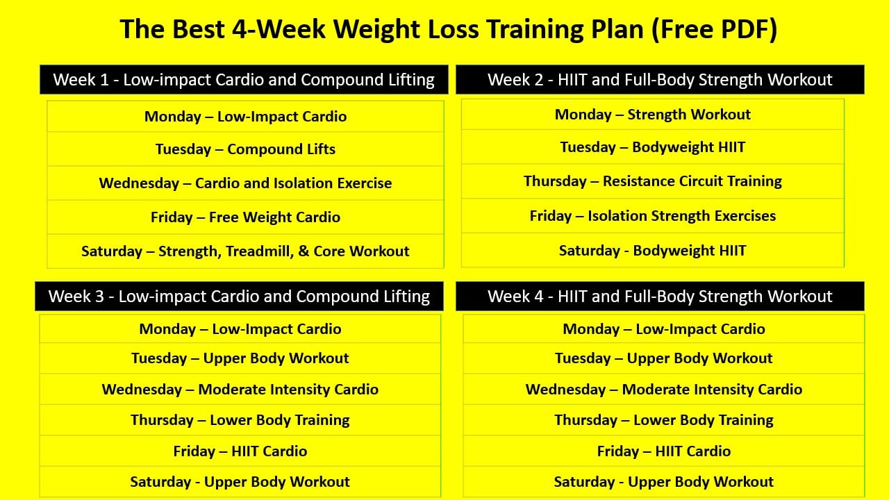 Here’s a summary of the 4-week gym workout plan for weight loss: