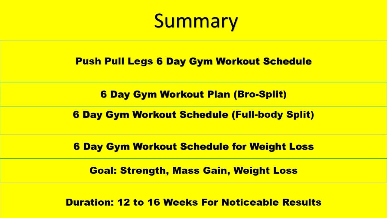 The primary goal of this article was to share multiple six-day workout routines. There can be more things to include in this article, but I’ve only focused on the workout schedule.