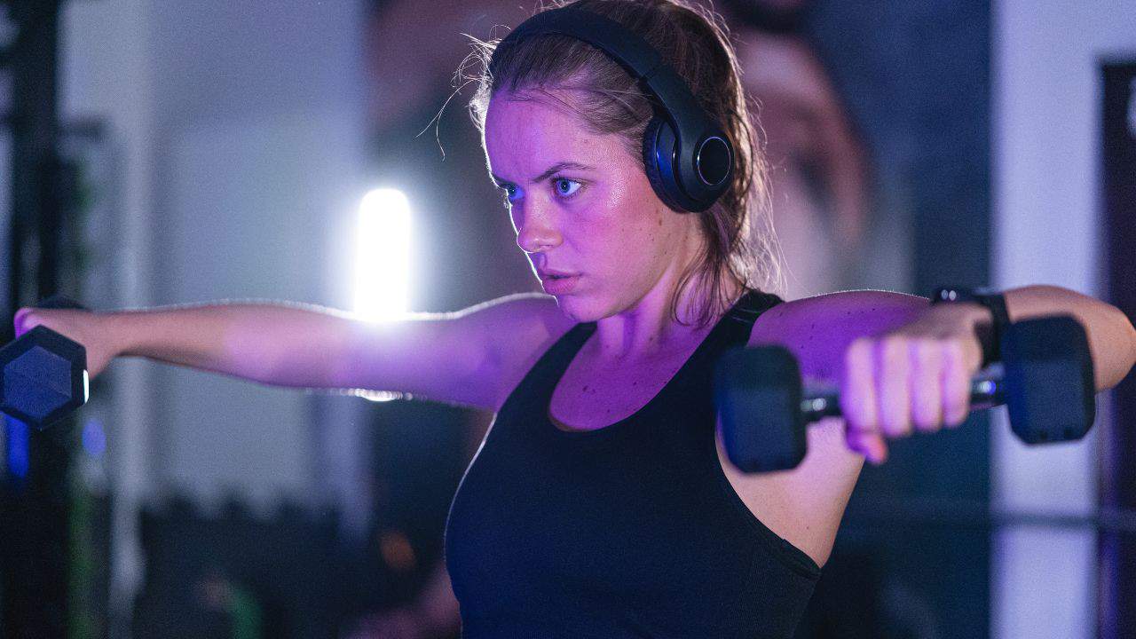 The dumbbell push press involves pressing the dumbbells overhead explosively using the core, legs, hips, and shoulder muscles.
